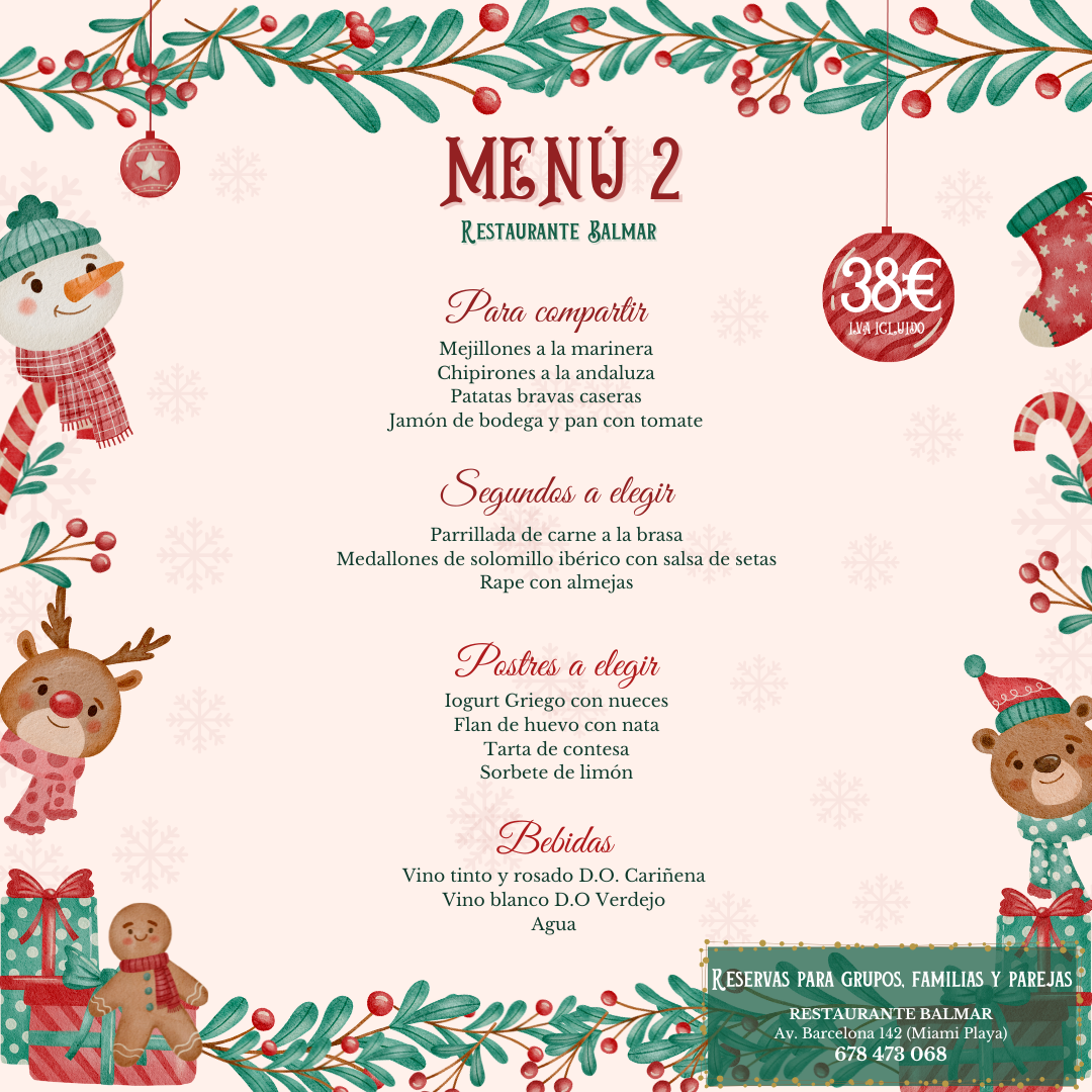 Si estás buscando menús de Navidad en Miami Playa, en Restaurante Balmar te ofrecemos una propuesta gastronómica completa para celebrar estas fiestas con familia, amigos o empresa. Nuestros menús de Navidad en Miami Platja, disponibles desde 28€, incluyen cóctel de bienvenida, platos elaborados con producto de calidad y un ambiente cálido ideal para cualquier celebración navideña.